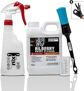 detailmate Felgenreiniger Set: ValetPRO Bilberry Wheel Cleaner 1 L - Felgen Reiniger Konzentrat + Kwazar Sprühflasche + ValetPRO chemieresistenter Felgen Pinsel + 50ml Messbecher + 2X Schutzhandschuh