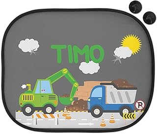 wolga-kreativ Auto Sonnenschutz und Sonnenblende Kinder Bagger Laster Auto Mädchen Junge mit Name für Baby und Kind personalisiert Wunschname Bedruckt